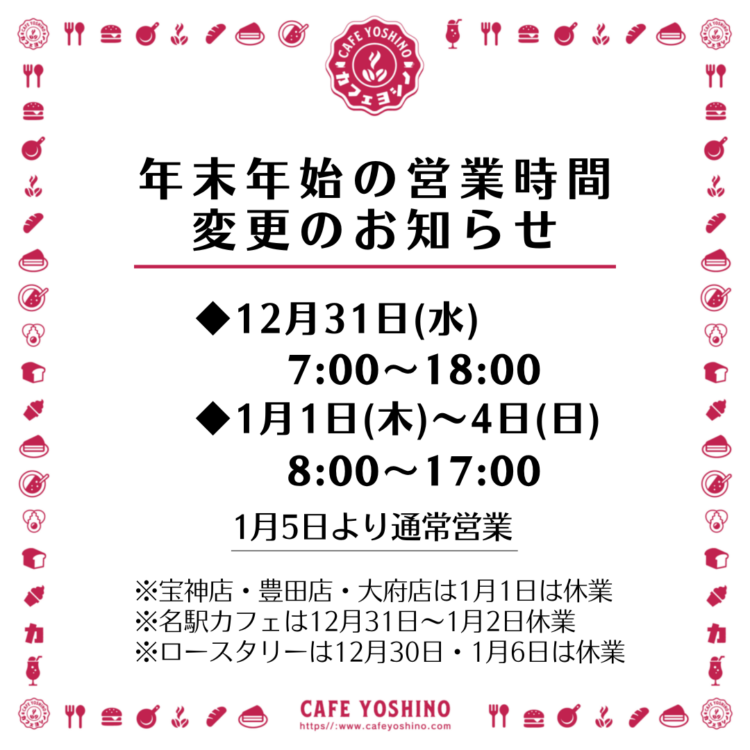 ※カフェヨシノロースタリーは12月30日(火)・1月6日(火)は定休日 ※宝神本店・豊田前山店・大府インター店は1月1日は休業 ※名駅店カフェは12月31日~1月2日は休業